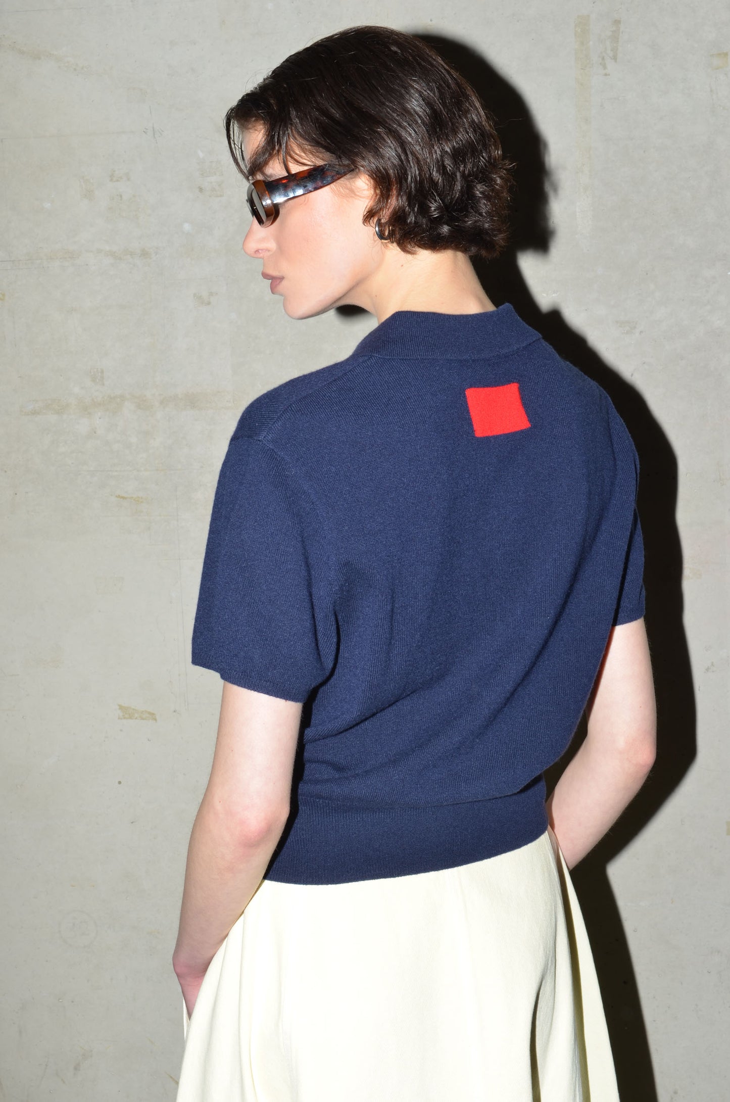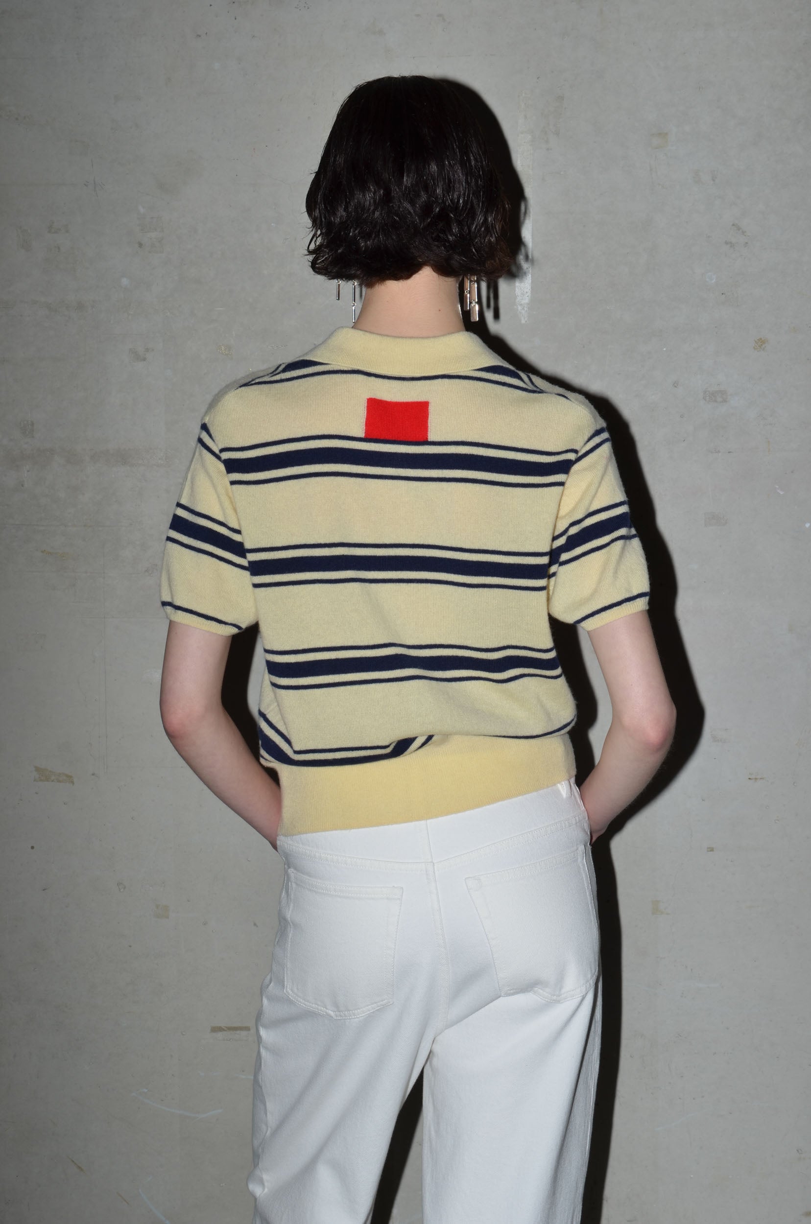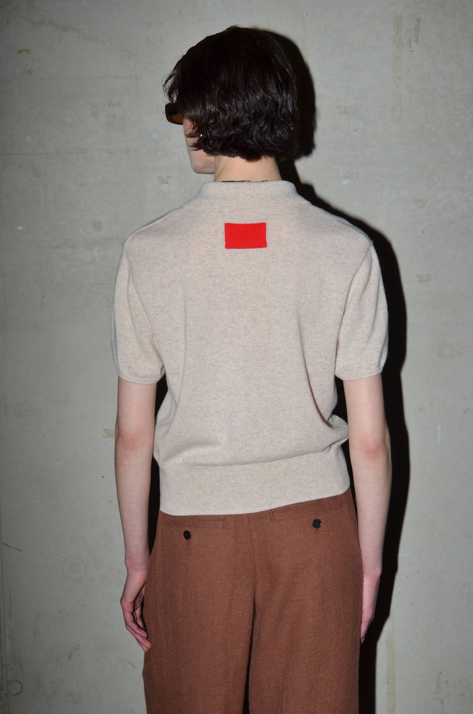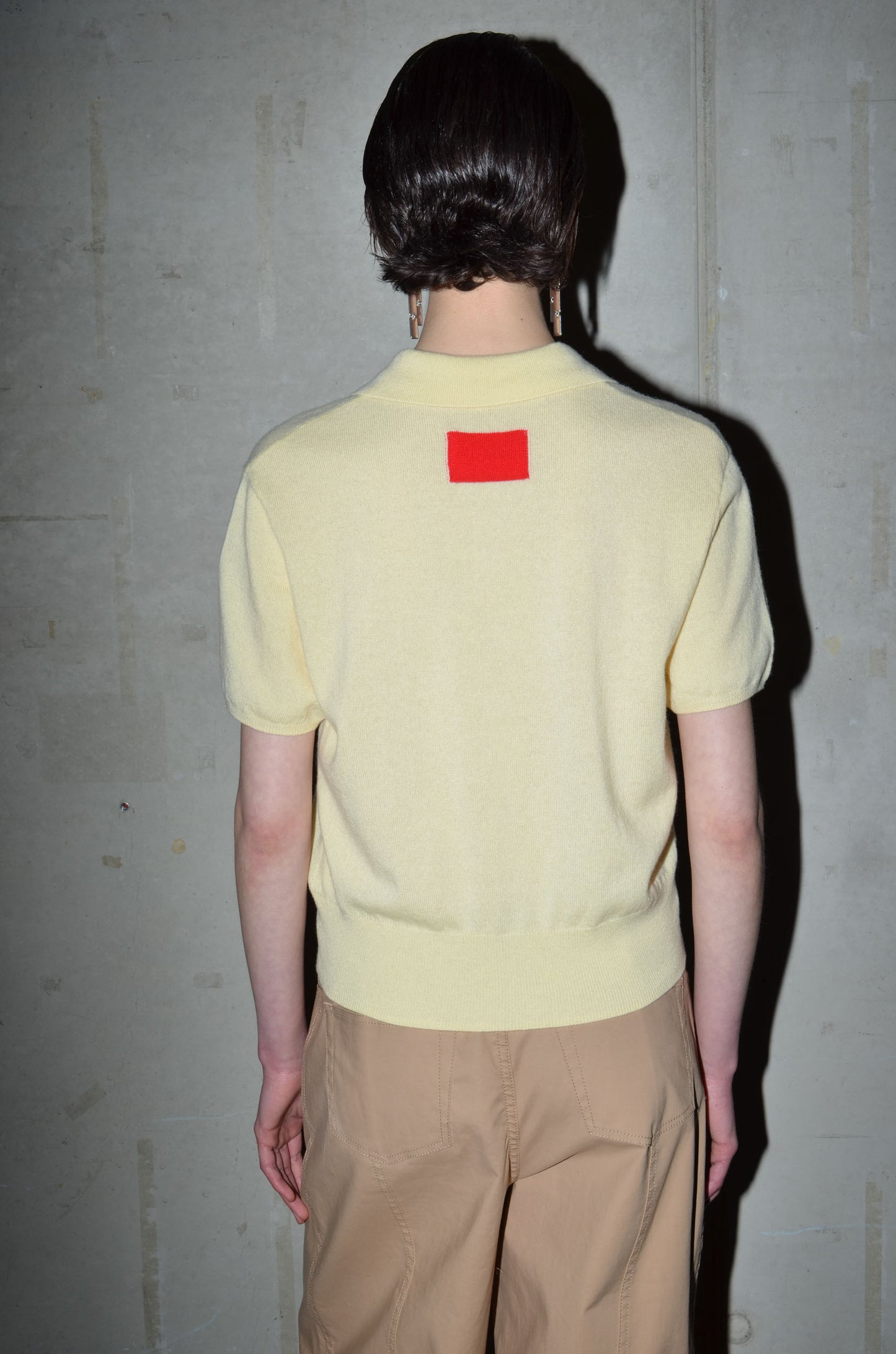 This knitted polo is made from 100% cashmere. It features a boxy fit, short sleeves and a button closure that extends just above the hem rib. Finished with a red rectangle detail in the back neck. Available in 8 colours: navy, bright red, pale banana, dark cherry, oatmeal, caramel, light grey and arctic blue.