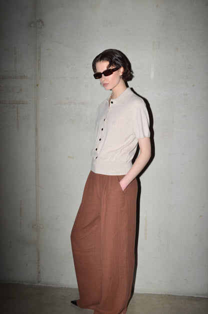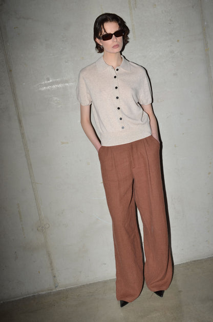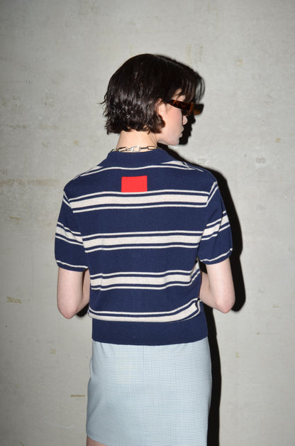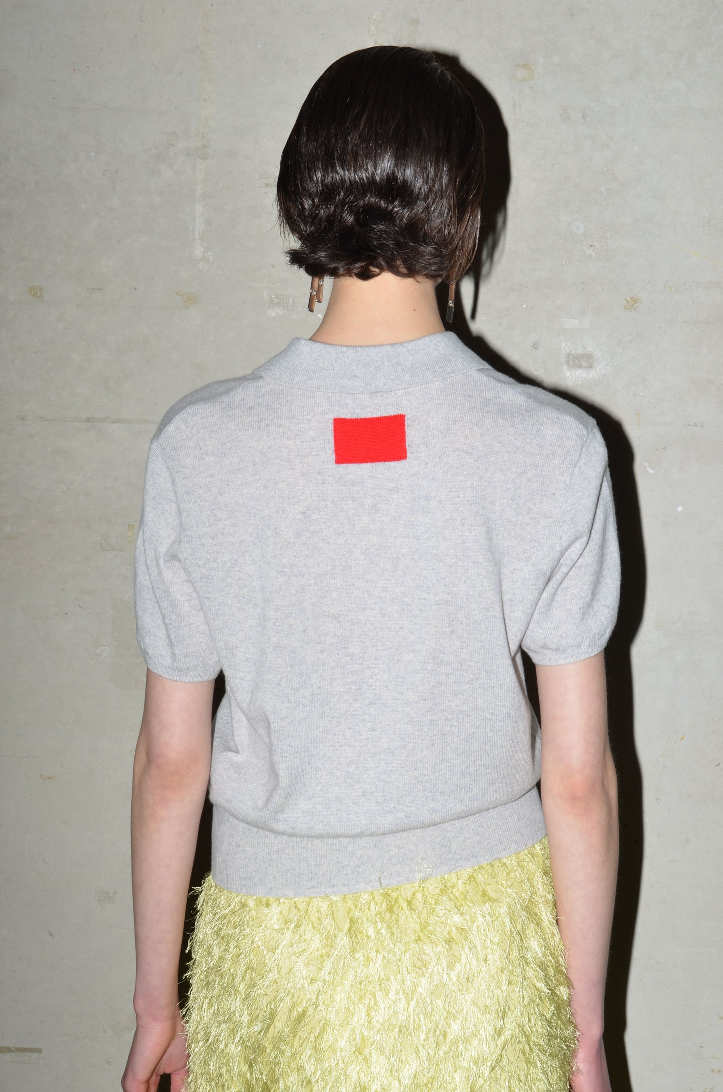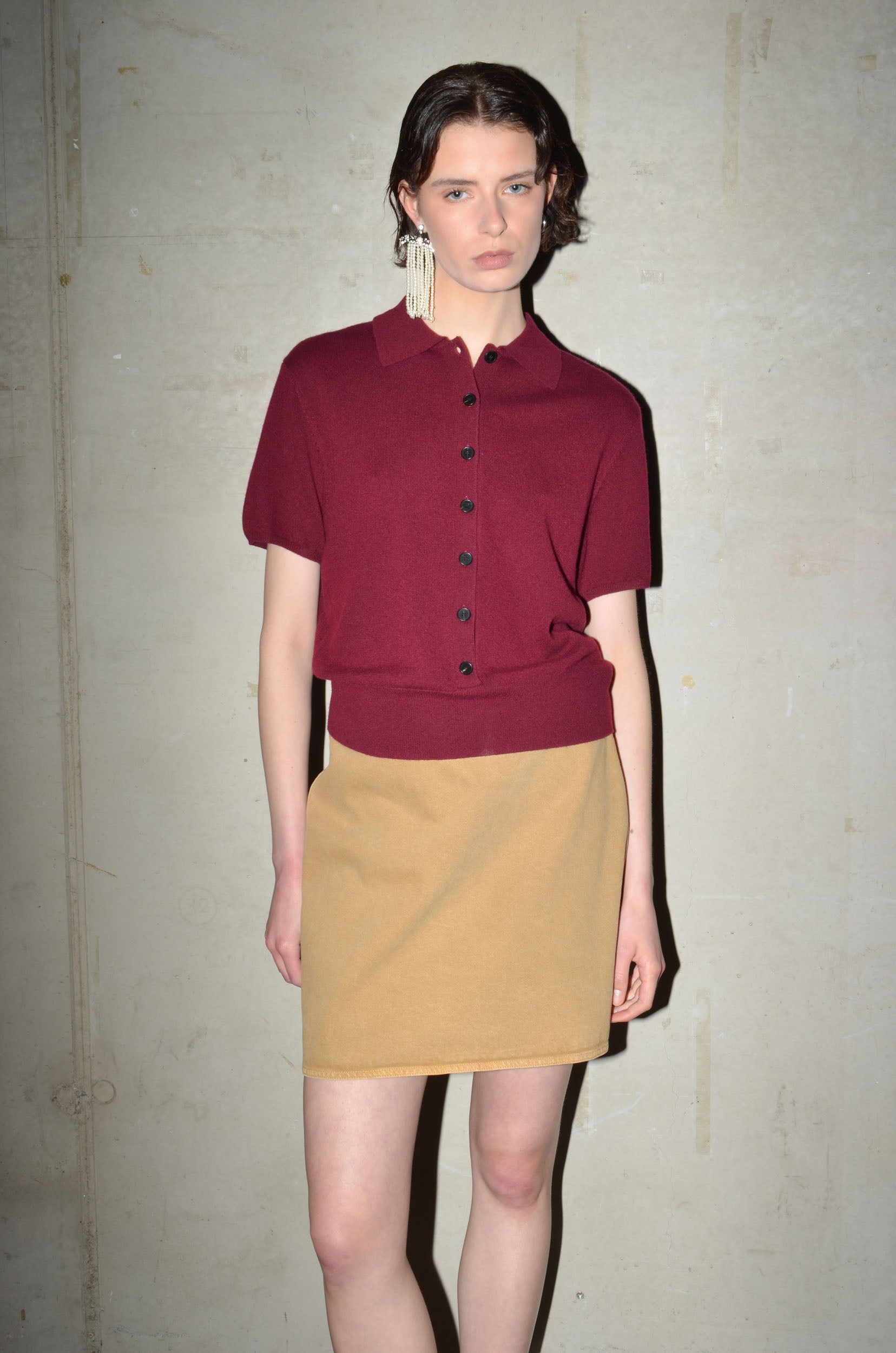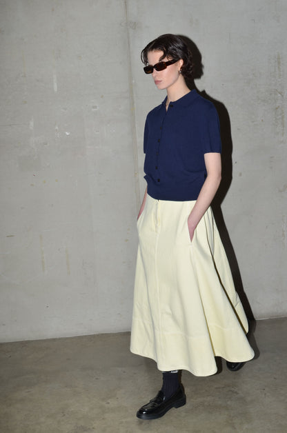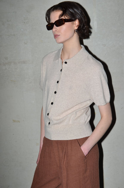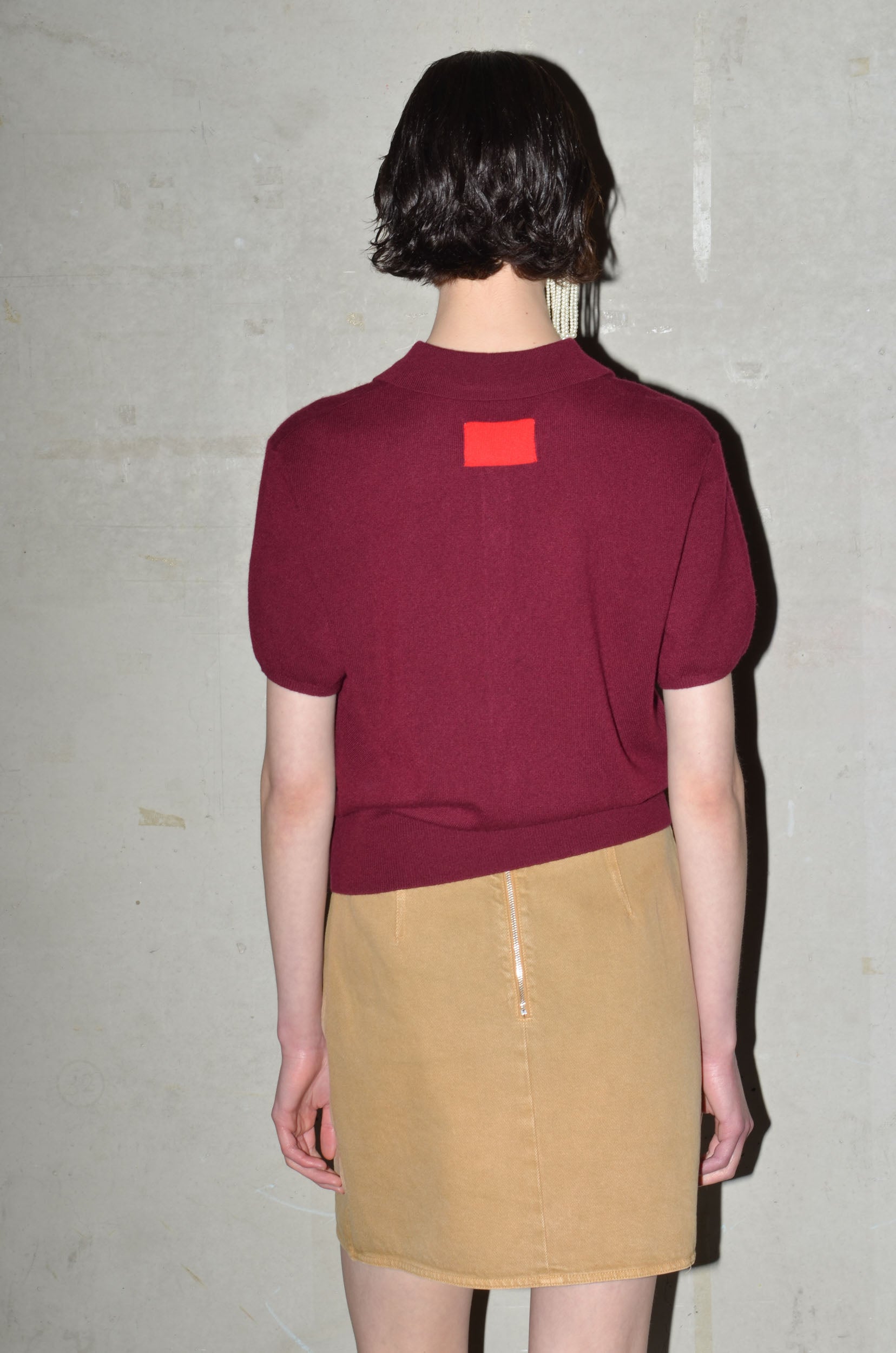 This knitted polo is made from 100% cashmere. It features a boxy fit, short sleeves and a button closure that extends just above the hem rib. Finished with a red rectangle detail in the back neck. Available in 8 colours: navy, bright red, pale banana, dark cherry, oatmeal, caramel, light grey and arctic blue.