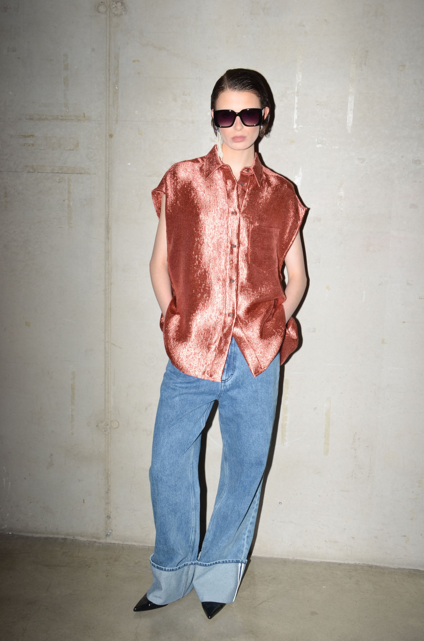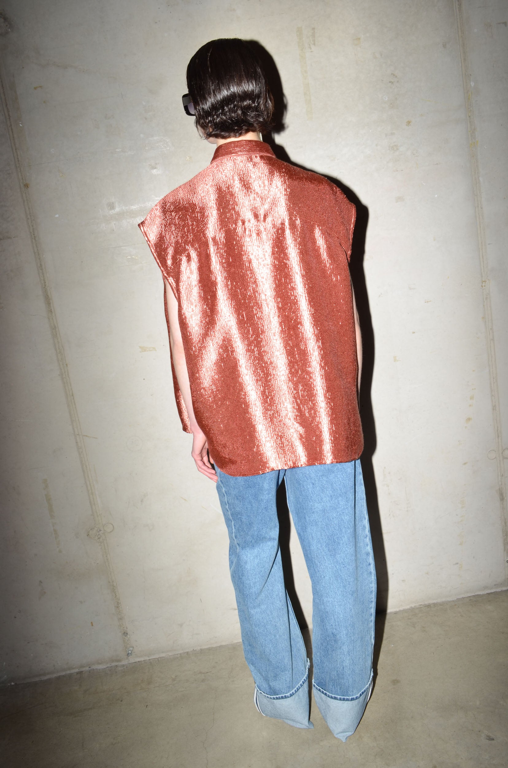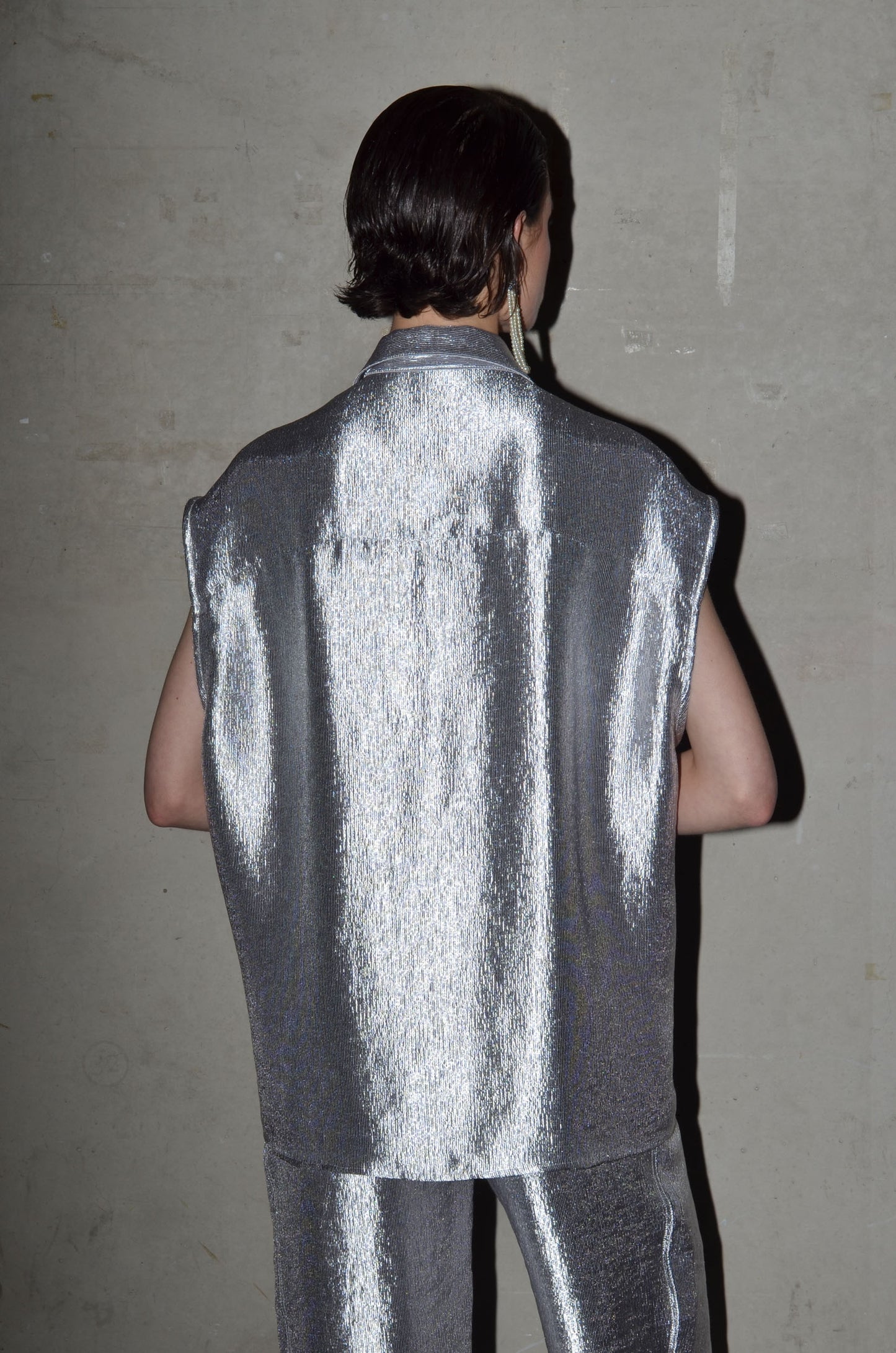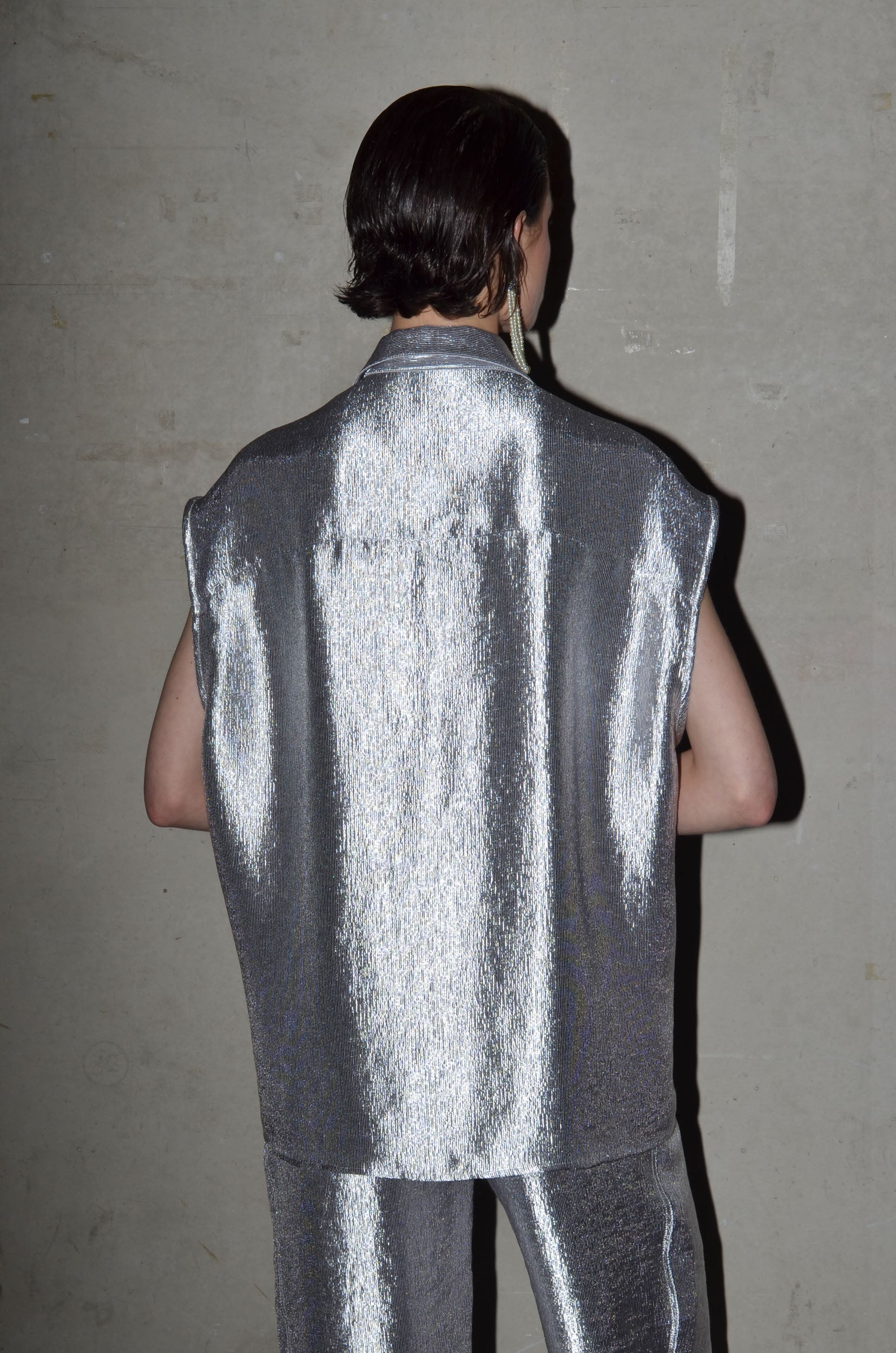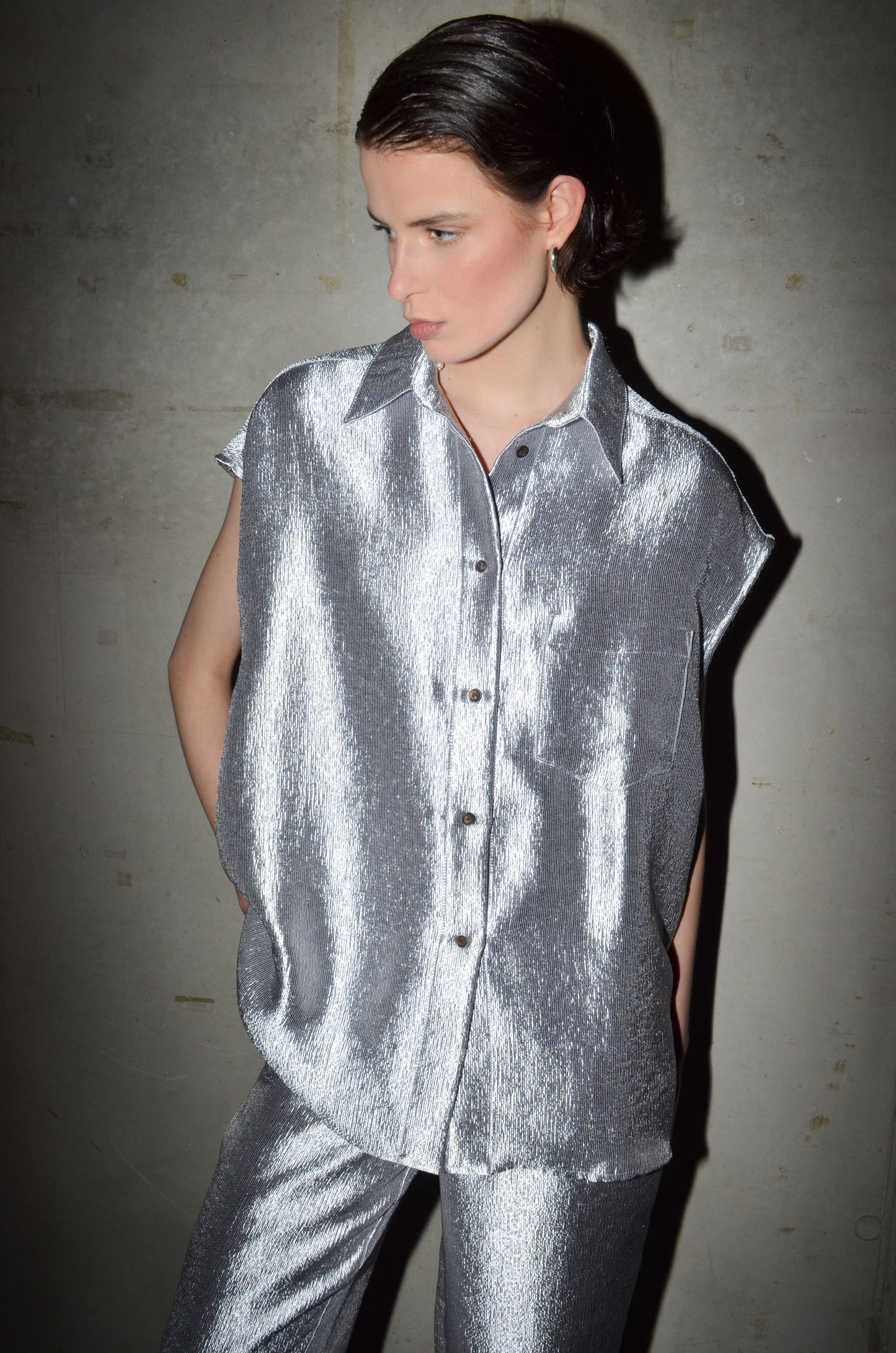 This long oversized shirt is cut from a delicate shiny textured fabric. Sleeveless, with an attached chest pocket, it’s a clean silhouette with subtle shine. A minimal shape with a refined surface.