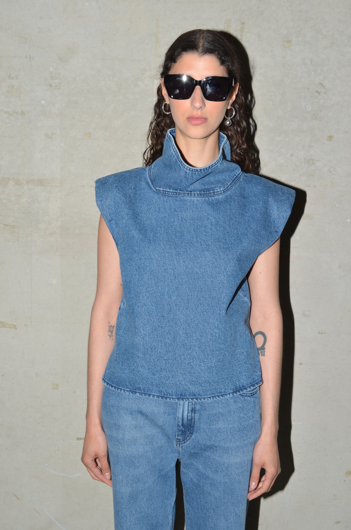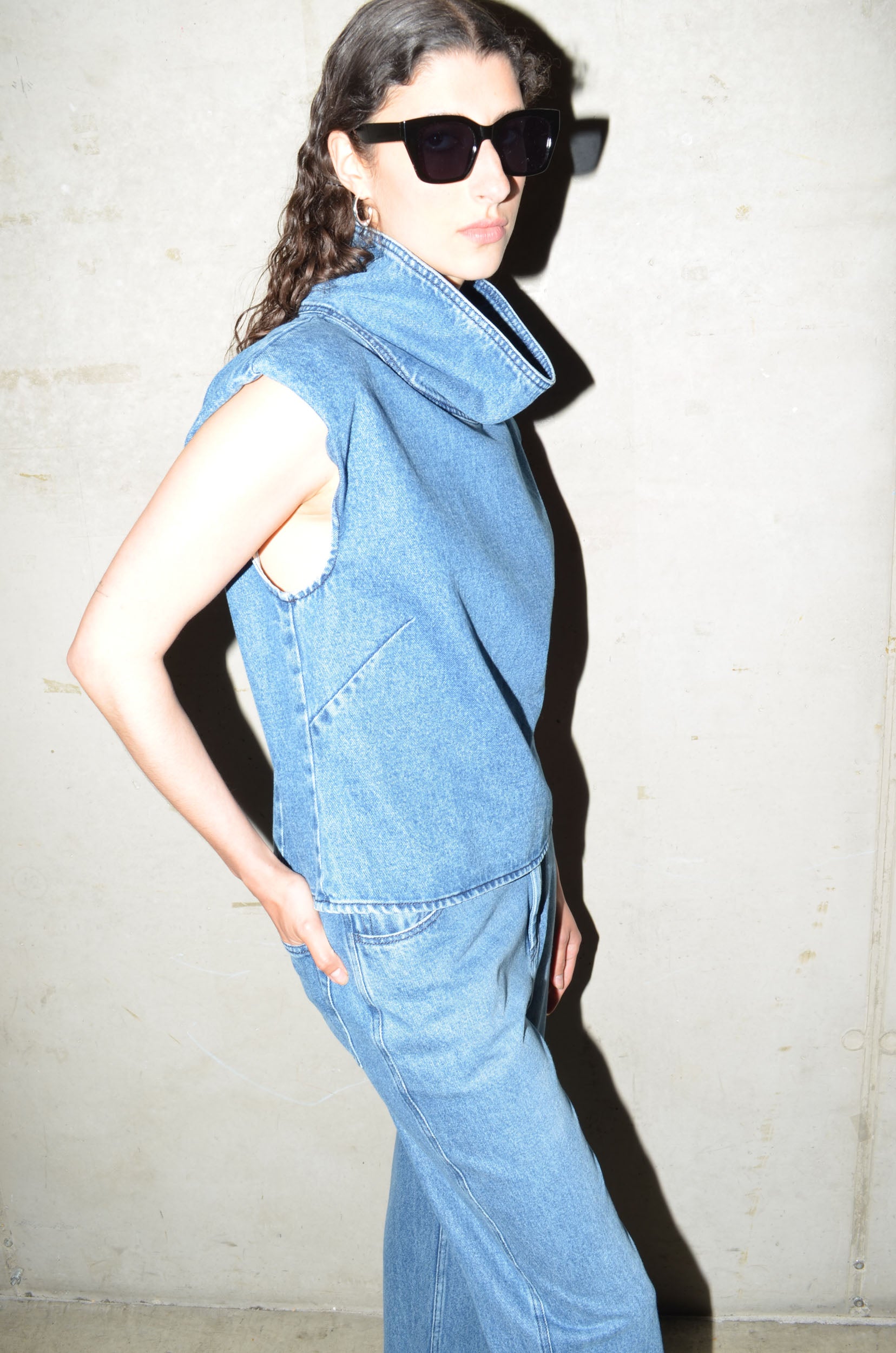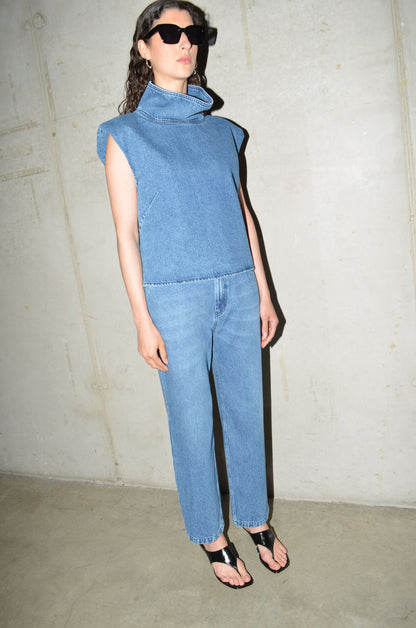 This denim top is cut from 100% cotton and comes in 4 colours. Designed with a high collar, shoulder pads and a sleeveless silhouette. Slightly shaped at the waist with bust and back darts. Finished with a back zip closure.