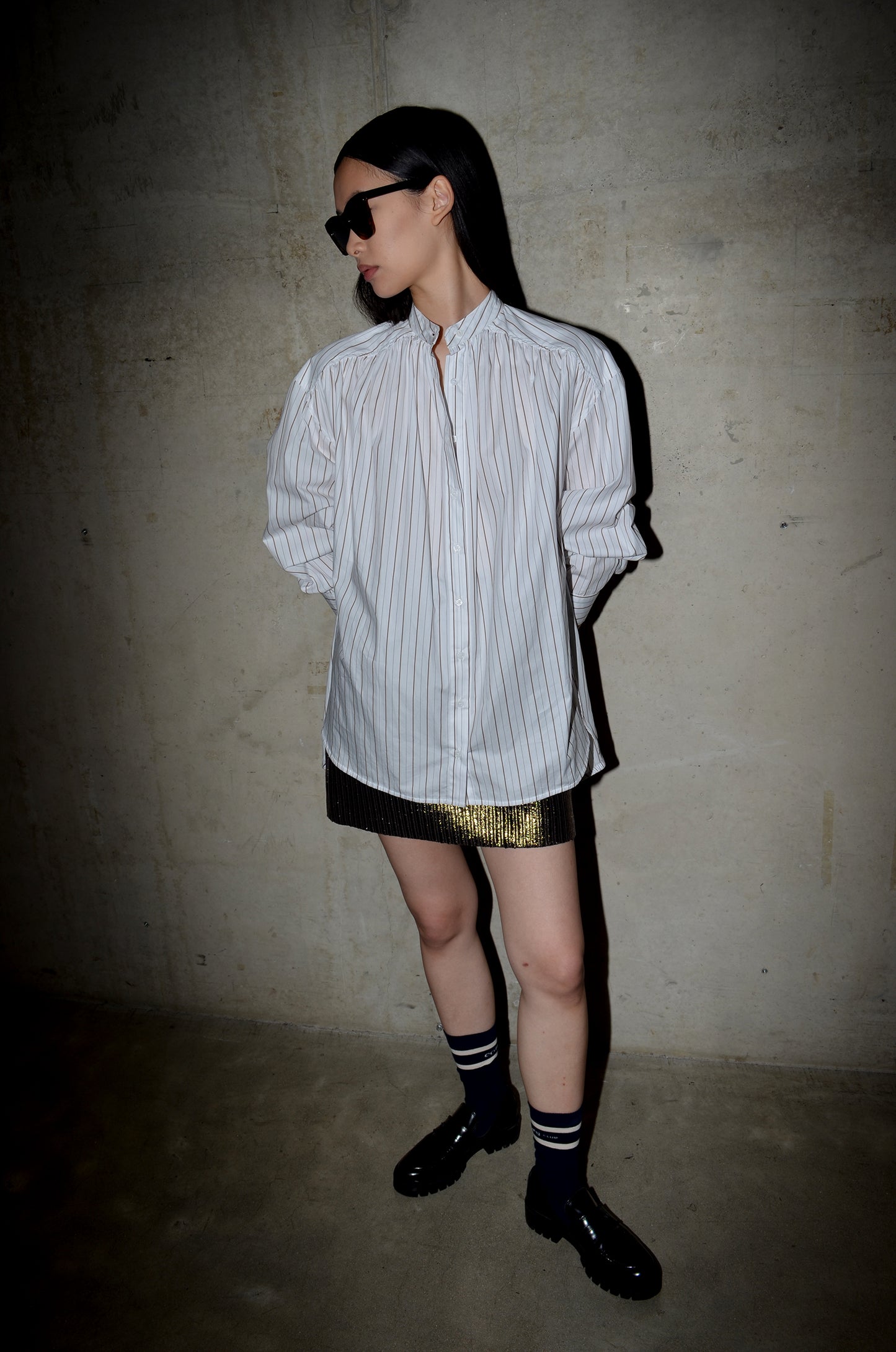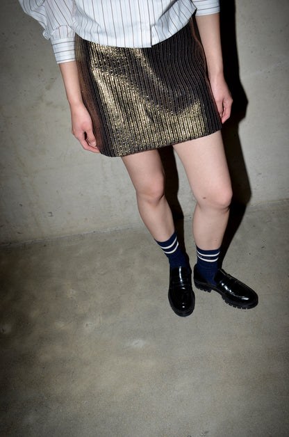 Short but sassy, the SCOOP skirt in the textured gold. Mini, with a minimal shape, made from a gold metallic coated corduroy fabric. Pair it with the matching TUBA top, a cosy knit or a crispy poplin shirt.